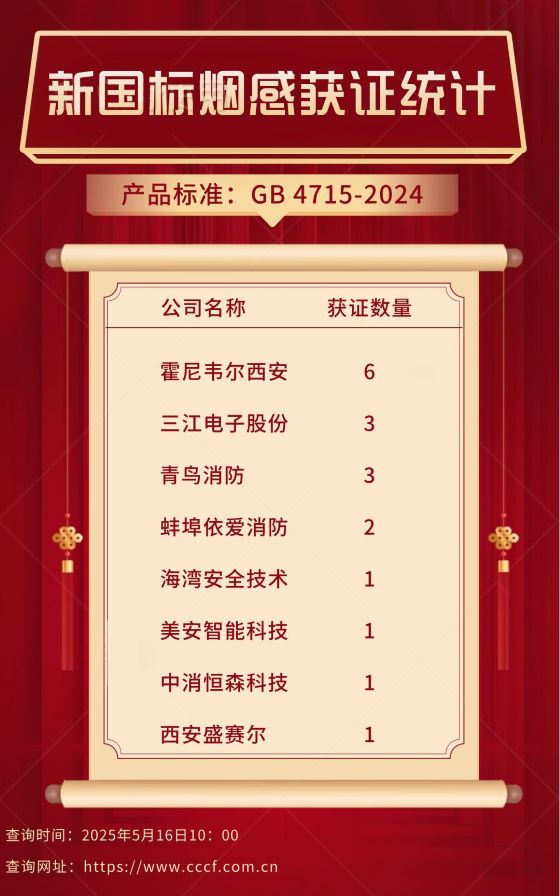 新國標光電感煙探測器獲證統計